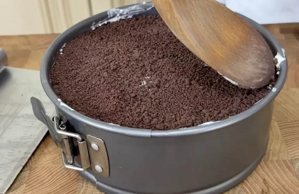 Į kepimo formos dugną supilkite pusę šokolado trupinių, išlyginkite, ant viršaus uždėkite grietinės su įdaru ir uždenkite likusiais trupiniais. Lengvai paspauskite kraštus, išlyginkite paviršių ir padėkite į šaldytuvą bent 2–3 valandoms, kad želatina sustingtų.