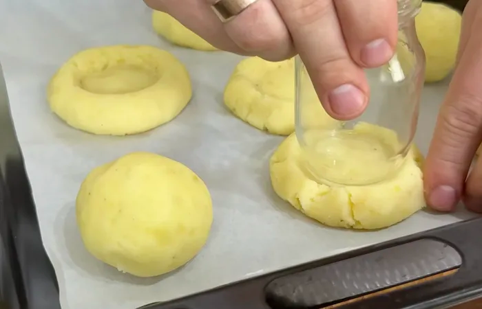 Įkaitinkite orkaitę iki 180 °C. Kepimo skardą išklokite kepimo popieriumi. Iš bulvių mišinio suformuokite maždaug 70 g sveriančius rutuliukus. Kad bulvės neliptų prie rankų, lengvai patepkite rankas aliejumi. Sudėkite rutuliukus ant kepimo skardos, palikdami tarp jų maždaug 5 cm atstumą.