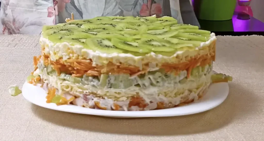 Ryškios, sultingos ir labai švelnios salotos, kurios kivių dėka pasižymi lengvu vaisių gaivumu. Tikra Naujųjų metų stalo puošmena!