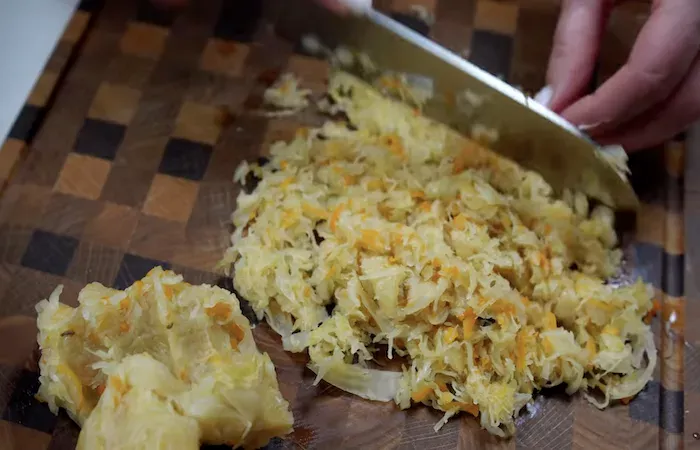 Raugintus kopūstus sudėkite į puodą, užpilkite nedideliu kiekiu šalto vandens – tiek, kad apsemtų. Užvirinkite ir virkite, kol suminkštės. Jei kopūstai per rūgštūs, galite juos pirmiausia nuplauti. Išvirtus kopūstus visiškai atvėsinkite, tada labai atsargiai nuspauskite skysčio perteklių ir smulkiai supjaustykite peiliu.