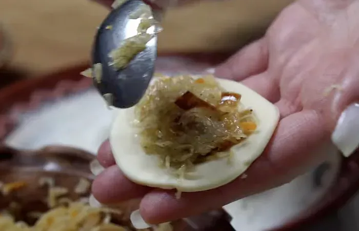 Įdaras: Į likusius keptus svogūnus sudėkite paruoštus kopūstus. Kepkite kartu kelias minutes, kad kopūstai šiek tiek apdžiūtų ir sugertų aliejaus aromatą. Pagal skonį pagardinkite druska ir juodaisiais pipirais. Įdarą atvėsinkite.