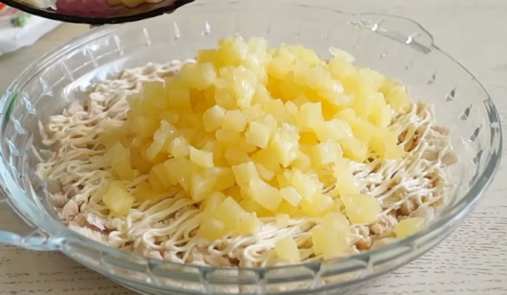 Sluoksniuotos salotos su vištiena, ananasais ir riešutais – klasikinis šventinio stalo patiekalas, kuris visada sulaukia dėmesio. Švelnios, sultingos, su kontrastu tarp saldžių ananasų ir sūrių riešutų.