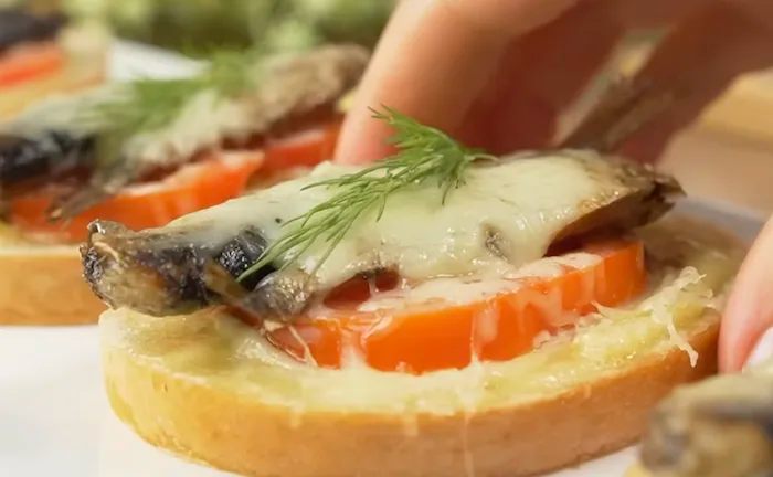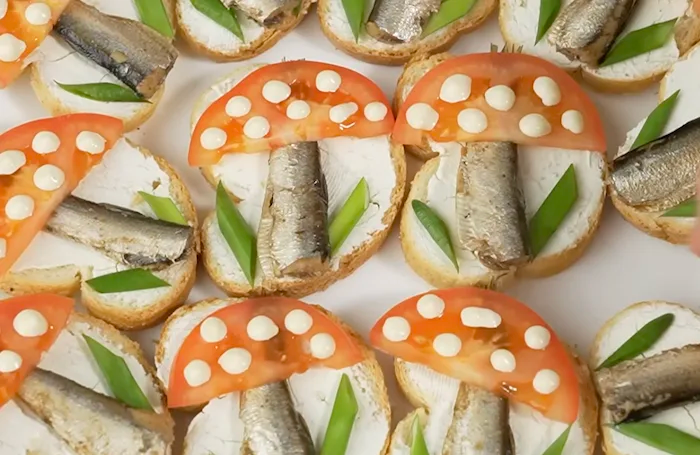 Supjaustykite prancūzišką batoną, aptepkite kreminio sūrio ir majonezo mišiniu. Ant viršaus sudėkite šprotus, ant viršaus išdėliokite pomidorų puseles „grybų“ formos ir papuoškite žaliaisiais svogūnais.