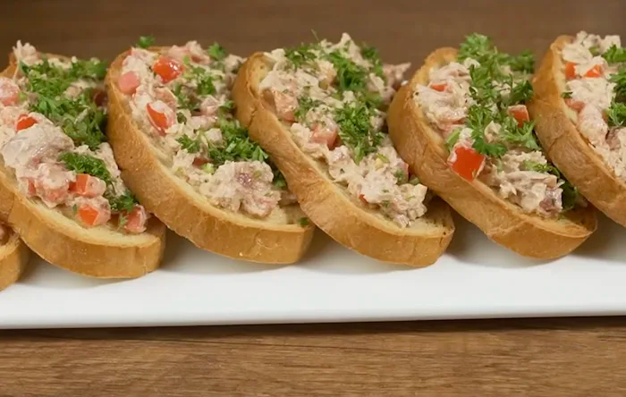 Sutrinkite tuną, įdėkite majonezo, česnako ir prieskonių. Užtepkite ant duonos, ant viršaus uždėkite pomidorų ir pabarstykite petražolėmis.