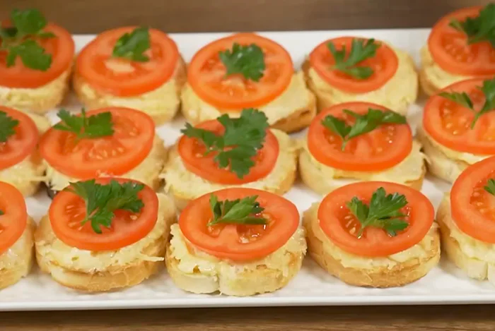 Sūrį sutarkuokite, sumaišykite su majonezu ir česnaku. Užtepkite ant prancūziško batono, ant viršaus uždėkite pomidorų griežinėlių.