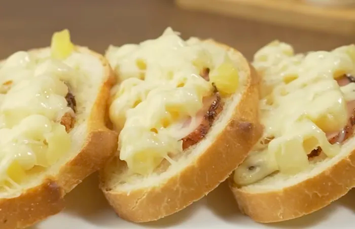 Ant duonos sudėkite šoninę ir ananasus, pabarstykite sūriu ir aptepkite majonezu. Jei norite, kepkite kelias minutes.