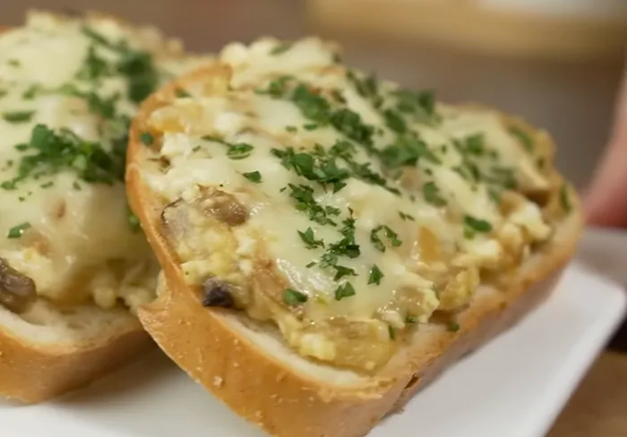 Kepkite grybus ir svogūnus, sumaišykite su sūriu ir kiaušiniu. Užtepkite ant kepalo, pabarstykite sūriu ir kepkite.