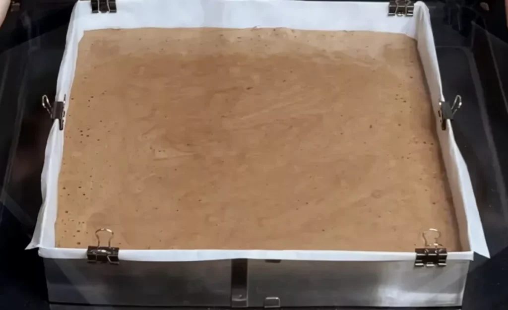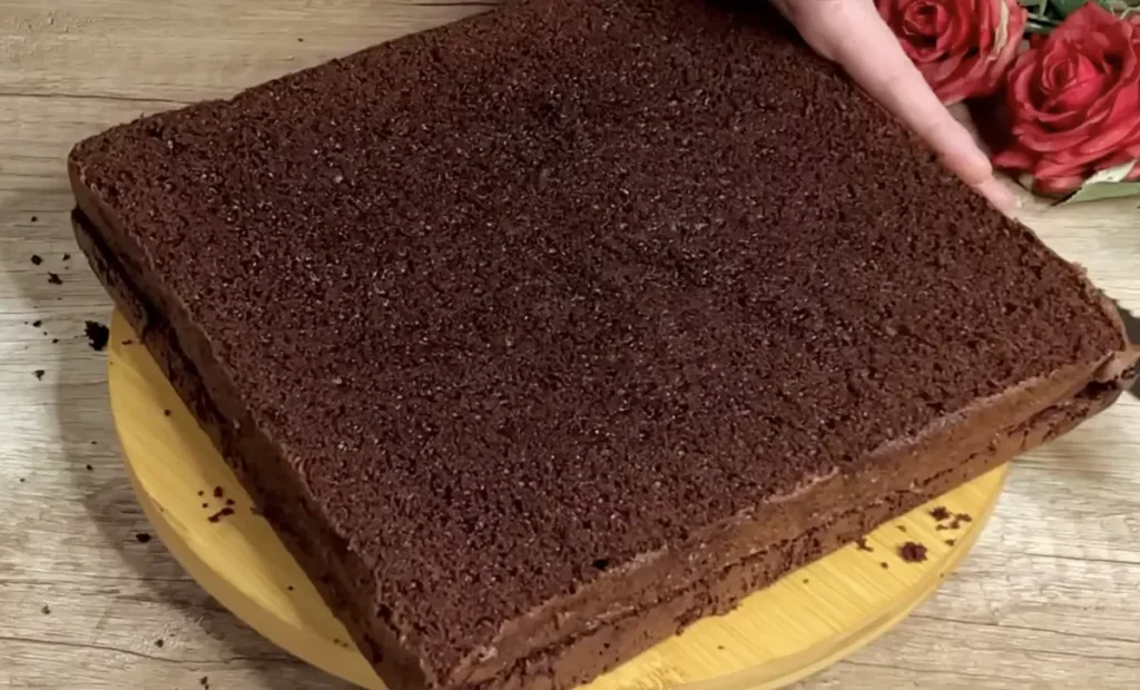 Sumaišykite sausus ingredientus: miltus, kakavą, krakmolą ir kepimo miltelius. Kiaušinius išplakite su cukrumi, vaniliniu cukrumi ir žiupsneliu druskos iki purumo. Įpilkite aliejaus ir pieno, maišykite mažu greičiu. Į kiaušinių mišinį persijokite pusę sausų ingredientų ir švelniai išmaišykite iš apačios į viršų. Sudėkite likusius sausus ingredientus ir vėl išmaišykite. Supilkite tešlą į maždaug 27 × 27 cm dydžio kepimo formą. Kepkite 160 °C temperatūroje apie 30 minučių, tikrindami iškepimą mediniu iešmeliu. Biskvitą atvėsinkite ant grotelių ir perpjaukite į dvi dalis.