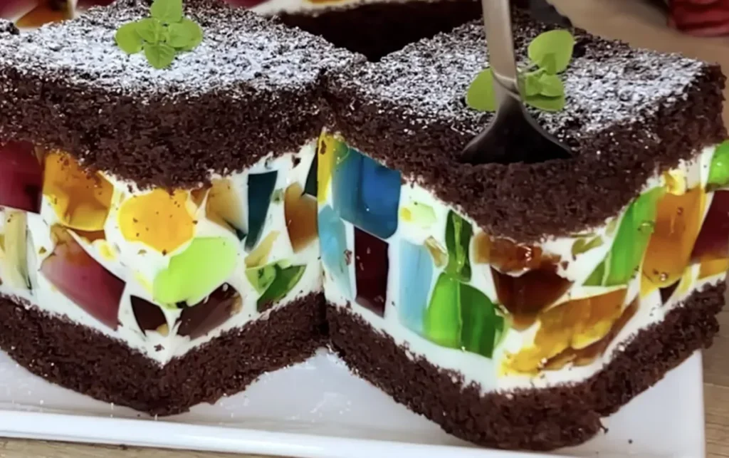 Užpilkite ploną kremo sluoksnį ant apatinio torto ir šaldykite 10 minučių. Į likusį kremą įmaišykite želė kubelius, išmaišykite.