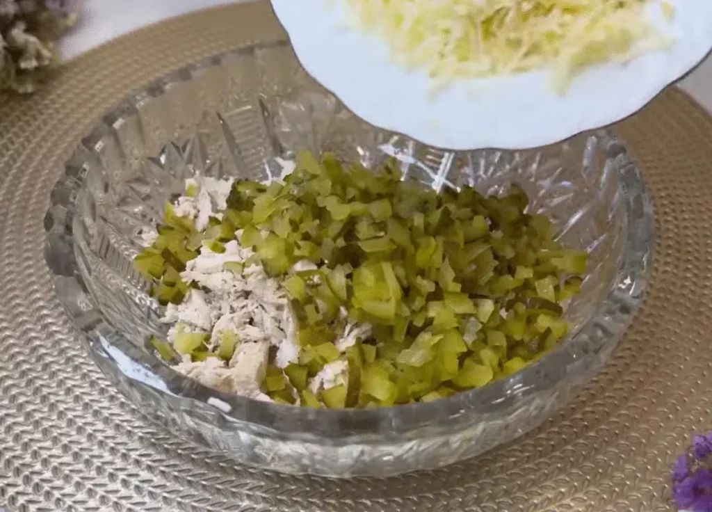 Vištienos filė išvirkite, kol iškeps, ir atvėsinkite. Tada mėsą smulkiai supjaustykite arba suplėšykite rankomis į mažus gabalėlius. Kiaušinius kietai išvirkite, atvėsinkite ir sutarkuokite smulkia tarka. Taip pat sutarkuokite kietąjį sūrį, o marinuotus agurkėlius supjaustykite kubeliais. Dubenyje sumaišykite vištienos filė, kiaušinius, sūrį ir agurkus, įdėkite garstyčių ir majonezo ir išmaišykite iki vientisos masės.
