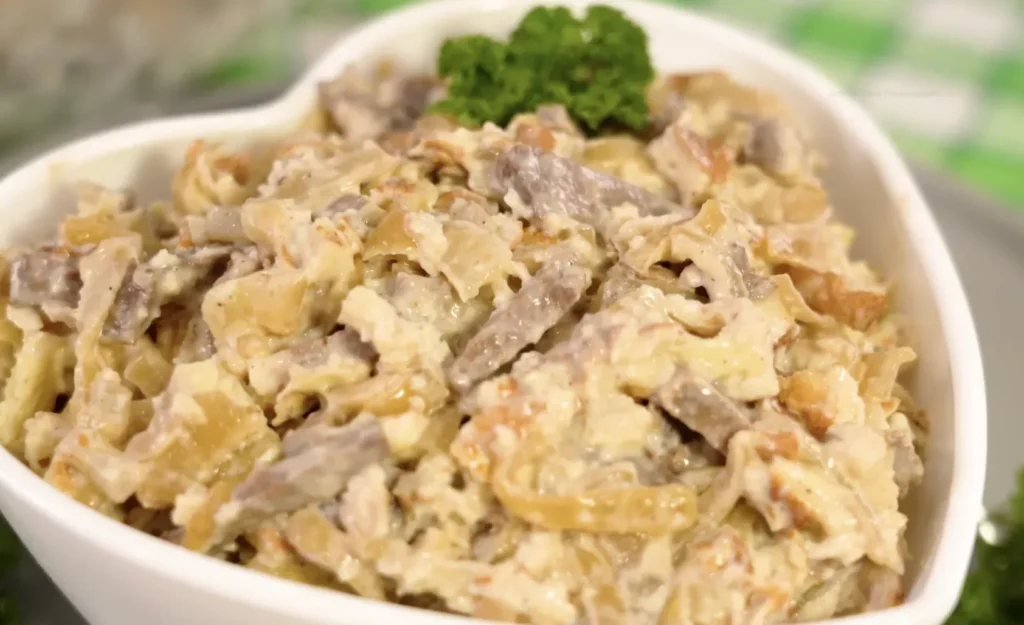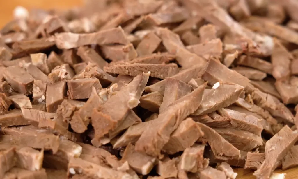 Virtą širdį supjaustykite juostelėmis išilgai pluoštų, kad ji išlaikytų formą. Galite naudoti jautienos arba kiaulienos širdį arba ją pakeisti vištienos širdimis, liežuviu ar virta mėsa.