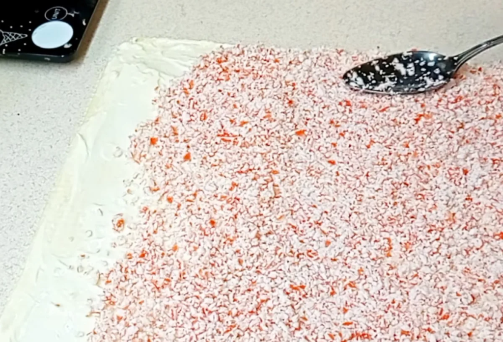 Pabarstykite sluoksnį smulkintomis krabų lazdelėmis. Tolimiausią kraštą palikite be krabų mišinio, atsitraukdami apie 3–4 cm.