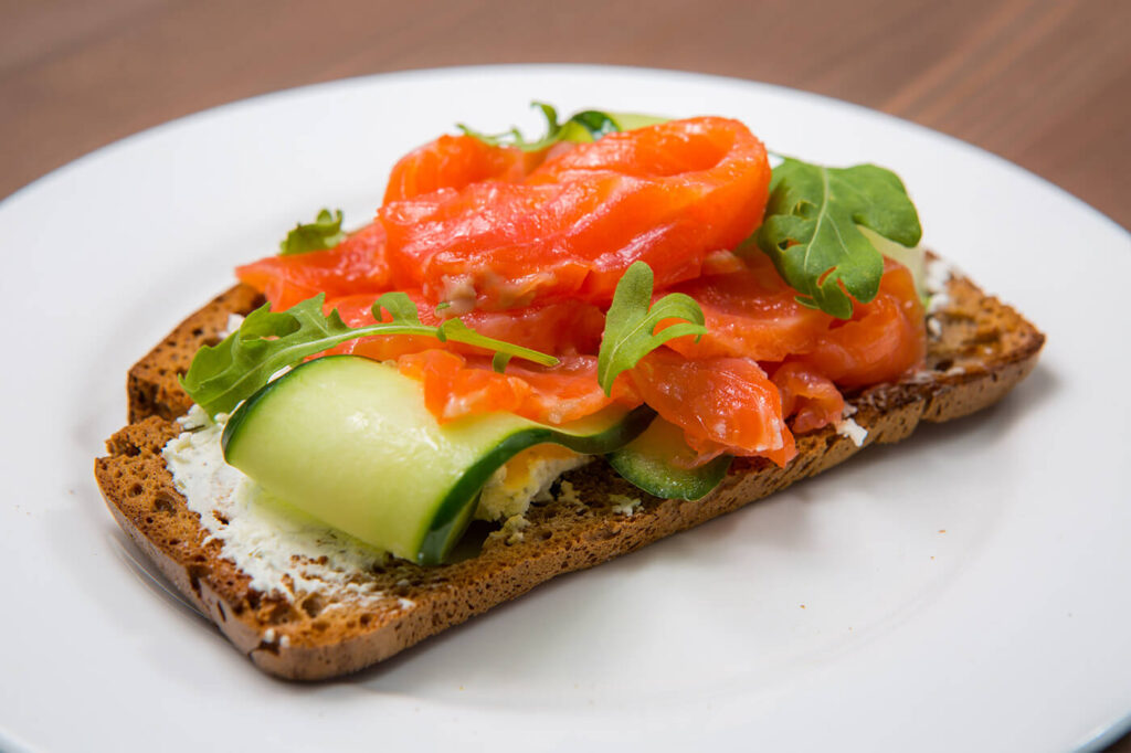 Trečiadienis : viso grūdo skrebutis su lašiša ir šviežiu agurku.